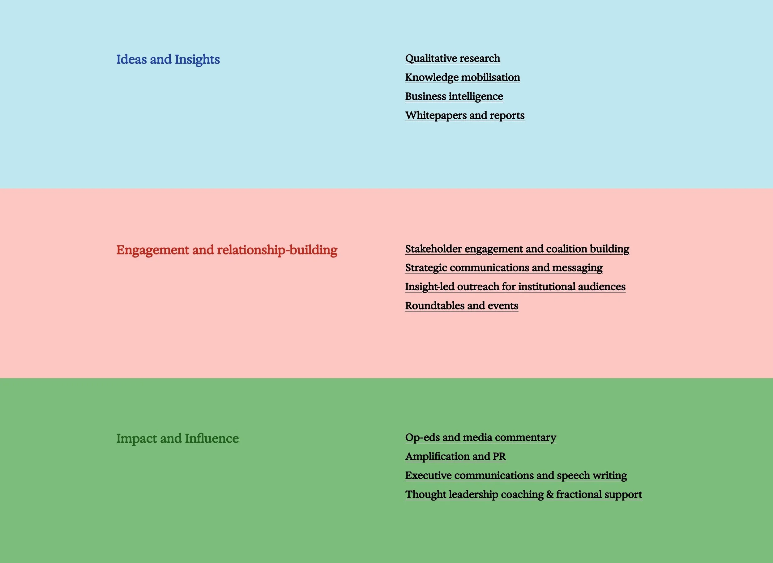 This is work we have long delivered behind the scenes: helping our clients understand the business and policy environments they operate within, testing ideas, building relationships and engaging serious audiences with substance and credibility.